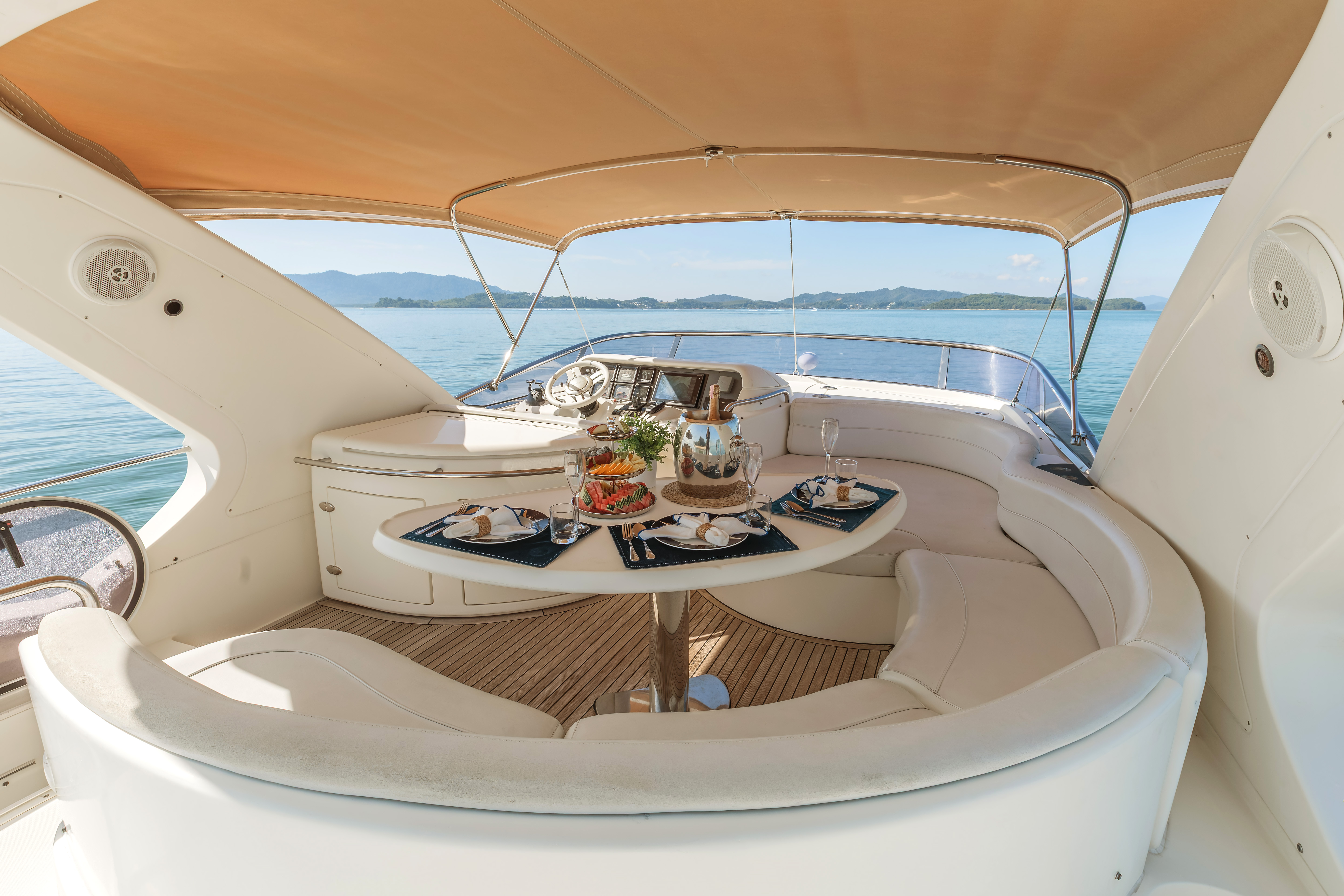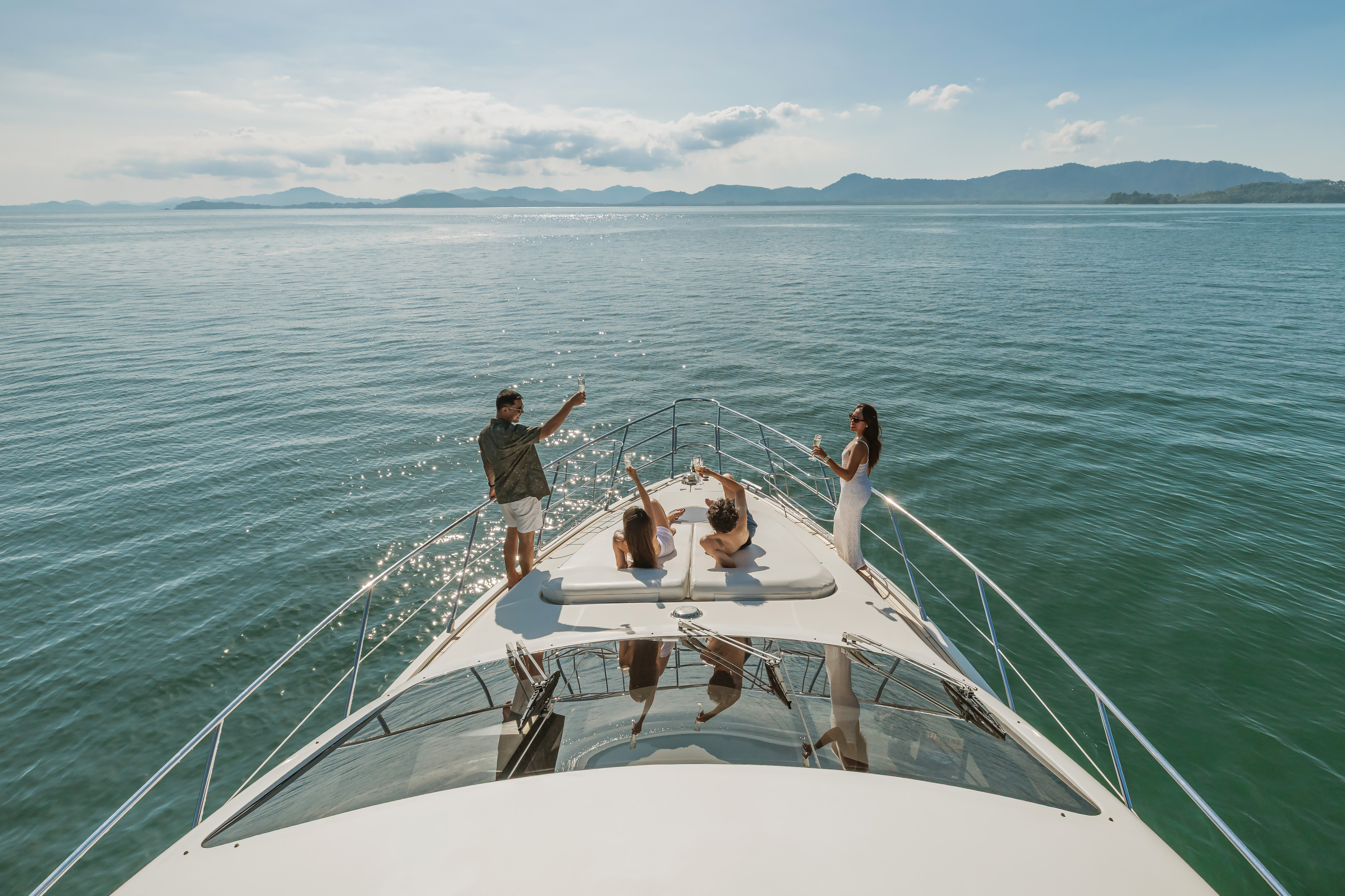 The Azimut 55ft is a sleek and luxurious Italian-style motor yacht perfect for cruising around Phuket and the Andaman Sea. At about 55 feet long, she features three comfortable cabins and can sleep up to 6 guests overnight while accommodating around 15 guests on day trips. Onboard, you’ll find modern comforts like air conditioning, sound system, snorkelling and paddleboard gear, drinks and snacks, plus a professional captain and crew — ideal for island hops, sunset cruises, or multi-day adventures.